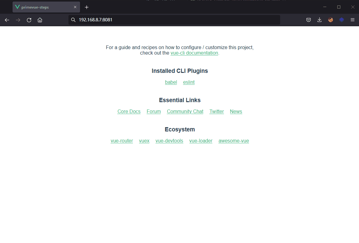 1 2 3 4 5 6 7 8 9 10 [mf~/project/demo/primevue-steps] (master) $ npm run serve DONE Compiled successfully in 300ms 11:39:34 AM App running at: - Local: http://localhost:8081/ - Network: http://192.168.8.7:8081/