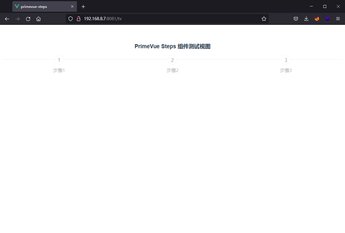2.4.1 在测试视图中使用steps组件 1 2 3 4 5 6 7 8 9 10 11 12 13 14 15 16 17 18 19 20 21 22 23 24 25 26 27 28 29 30 31 32 33 34 35 36 37 38 39 40 41 42 43 44 45 46 47 48 49 50 51 52 53 54 55 56 57 58 59 60 61 62 63 64 65 66 67 68 69 70 71 72 73 74 75 76 77 78 79 80 81 82 83 84 85 86 87 88 89 <template > <h3 > PrimeVue Steps 组件测试视图</h3 > <Steps :model ="stepsItems" :readonly ="true" /> <router-view v-slot ="{ Component }" :formData ="formObject" @prevPage ="prevPage($event)" @nextPage ="nextPage($event)" @complete ="complete($event)" > <keep-alive > <component :is ="Component" /> </keep-alive > </router-view > </template > <script > import { ref } from 'vue' import { useRouter } from 'vue-router' import Steps from 'primevue/steps' export default { name : 'TestView' , components : { Steps }, setup ( ) { const router = useRouter () const stepsItems = ref ([ { label : '步骤1' , to : '/tv/p1' }, { label : '步骤2' , to : '/tv/p2' }, { label : '步骤3' , to : '/tv/p3' }, ]) const formObject = ref ({ msg : 'Steps数据' }) const nextPage = (data ) => { console .info (`Steps: ${stepsItems.value[data.value.index].label} 传递的数据` , data.value ) router.push (stepsItems.value [data.value .index + 1 ].to ); } const prevPage = (data ) => { router.push (stepsItems.value [data.value .index - 1 ].to ); }; const complete = (data ) => { console .info (`Steps: ${stepsItems.value[data.value.index].label} 传递的数据` , data.value ) alert ('步骤完成' ) }; return { stepsItems, formObject, nextPage, prevPage, complete } } } </script >