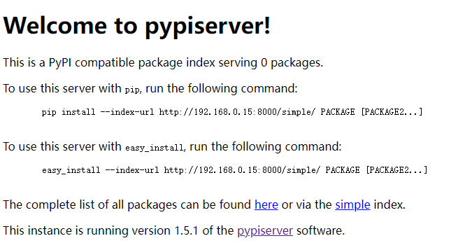 pypiserver 默认监听 8080 端口,访问 http://youip:8080 ,如果可以看到欢迎页面,表示服务启动成功