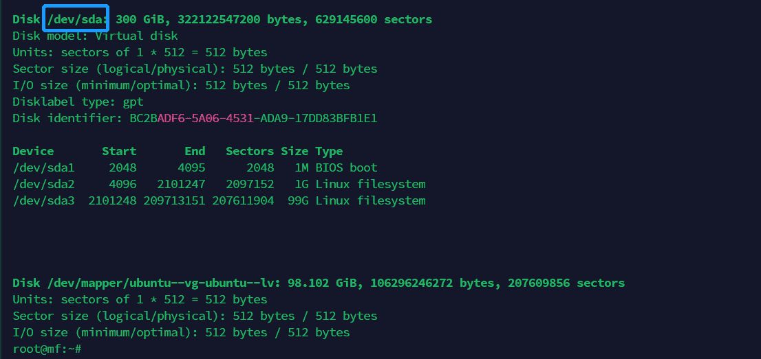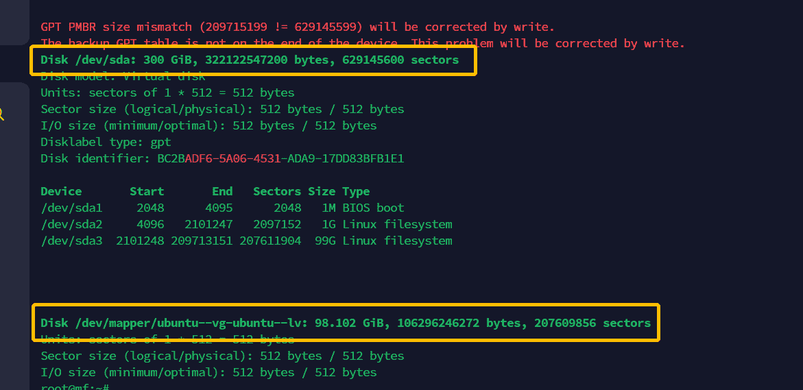 1 2 3 4 5 6 7 8 9 10 11 12 13 14 15 16 17 18 19 20 21 22 23 24 25 26 27 28 29 30 31 32 33 34 35 36 37 38 39 40 41 42 43 44 45 46 47 48 49 50 51 52 53 54 55 56 57 58 59 60 61 62 63 64 65 66 67 68 69 70 71 root@mf:~ Disk /dev/loop0: 55.62 MiB, 58310656 bytes, 113888 sectors Units: sectors of 1 * 512 = 512 bytes Sector size (logical/physical): 512 bytes / 512 bytes I/O size (minimum/optimal): 512 bytes / 512 bytes Disk /dev/loop1: 55.62 MiB, 58310656 bytes, 113888 sectors Units: sectors of 1 * 512 = 512 bytes Sector size (logical/physical): 512 bytes / 512 bytes I/O size (minimum/optimal): 512 bytes / 512 bytes Disk /dev/loop2: 63.28 MiB, 66347008 bytes, 129584 sectors Units: sectors of 1 * 512 = 512 bytes Sector size (logical/physical): 512 bytes / 512 bytes I/O size (minimum/optimal): 512 bytes / 512 bytes Disk /dev/loop3: 63.29 MiB, 66355200 bytes, 129600 sectors Units: sectors of 1 * 512 = 512 bytes Sector size (logical/physical): 512 bytes / 512 bytes I/O size (minimum/optimal): 512 bytes / 512 bytes Disk /dev/loop4: 91.83 MiB, 96272384 bytes, 188032 sectors Units: sectors of 1 * 512 = 512 bytes Sector size (logical/physical): 512 bytes / 512 bytes I/O size (minimum/optimal): 512 bytes / 512 bytes Disk /dev/loop5: 91.85 MiB, 96292864 bytes, 188072 sectors Units: sectors of 1 * 512 = 512 bytes Sector size (logical/physical): 512 bytes / 512 bytes I/O size (minimum/optimal): 512 bytes / 512 bytes Disk /dev/loop6: 49.85 MiB, 52248576 bytes, 102048 sectors Units: sectors of 1 * 512 = 512 bytes Sector size (logical/physical): 512 bytes / 512 bytes I/O size (minimum/optimal): 512 bytes / 512 bytes Disk /dev/loop7: 49.86 MiB, 52260864 bytes, 102072 sectors Units: sectors of 1 * 512 = 512 bytes Sector size (logical/physical): 512 bytes / 512 bytes I/O size (minimum/optimal): 512 bytes / 512 bytes GPT PMBR size mismatch (209715199 != 629145599) will be corrected by write. The backup GPT table is not on the end of the device. This problem will be corrected by write. Disk /dev/sda: 300 GiB, 322122547200 bytes, 629145600 sectors Disk model: Virtual disk Units: sectors of 1 * 512 = 512 bytes Sector size (logical/physical): 512 bytes / 512 bytes I/O size (minimum/optimal): 512 bytes / 512 bytes Disklabel type : gpt Disk identifier: BC2BADF6-5A06-4531-ADA9-17DD83BFB1E1 Device Start End Sectors Size Type /dev/sda1 2048 4095 2048 1M BIOS boot /dev/sda2 4096 2101247 2097152 1G Linux filesystem /dev/sda3 2101248 209713151 207611904 99G Linux filesystem Disk /dev/mapper/ubuntu--vg-ubuntu--lv: 98.102 GiB, 106296246272 bytes, 207609856 sectors Units: sectors of 1 * 512 = 512 bytes Sector size (logical/physical): 512 bytes / 512 bytes I/O size (minimum/optimal): 512 bytes / 512 bytes
